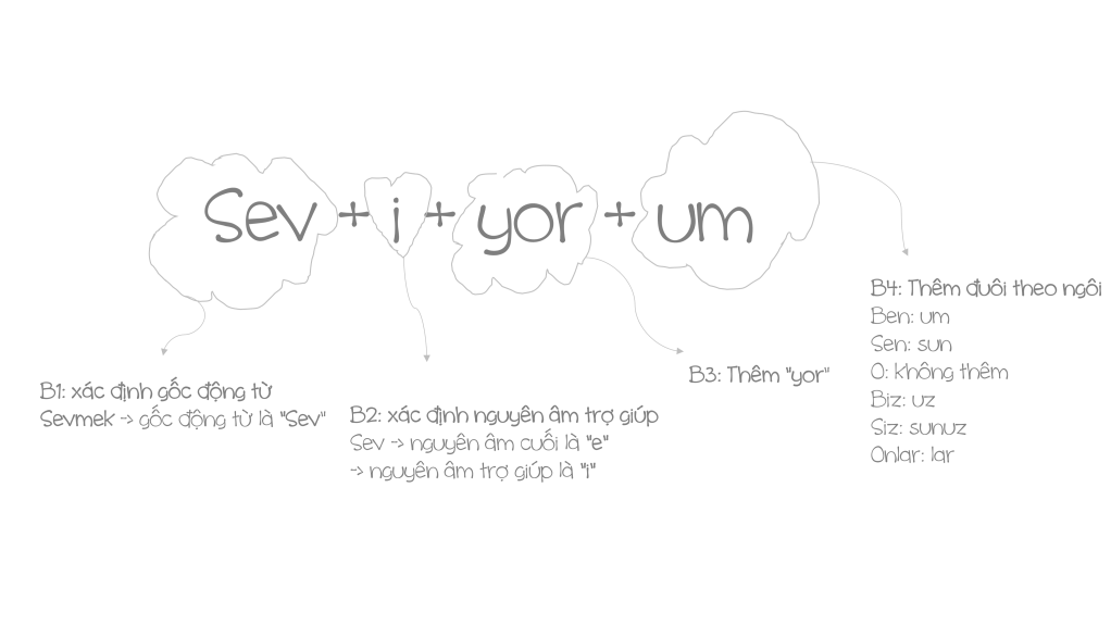 - B4: Thêm đuôi theo ngôi (Ben -> um, sen -> sun, o -> không thêm, biz -> uz, siz -> sunuz, onlar -> lar )