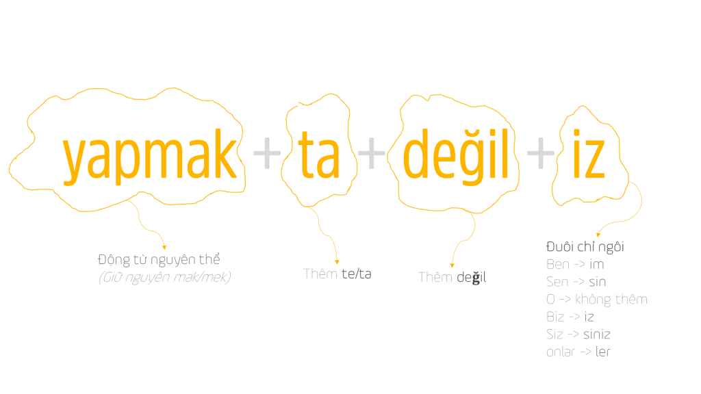 Cách 2: Động từ nguyên thể + te/ta + değil + đuôi chỉ ngôi