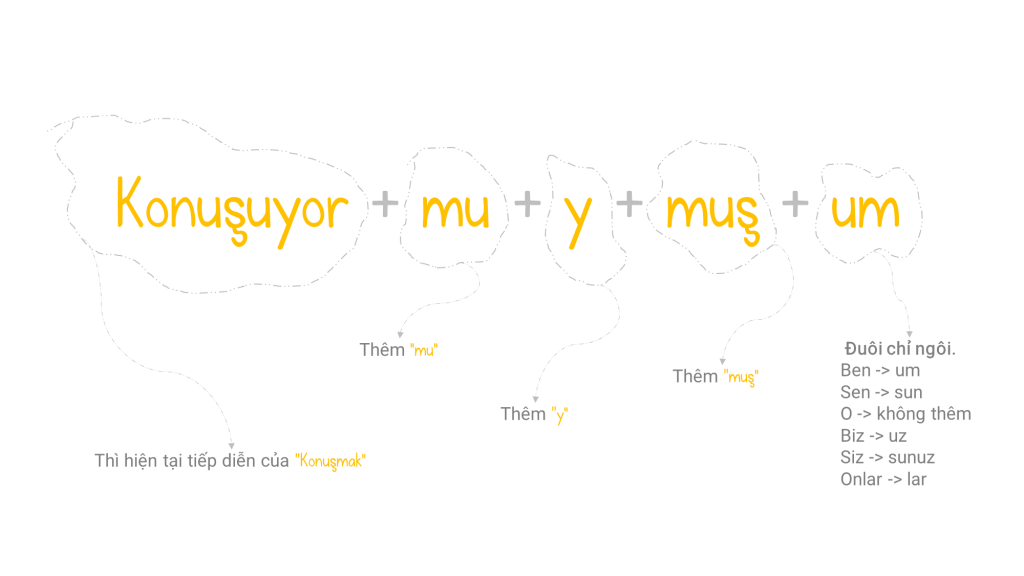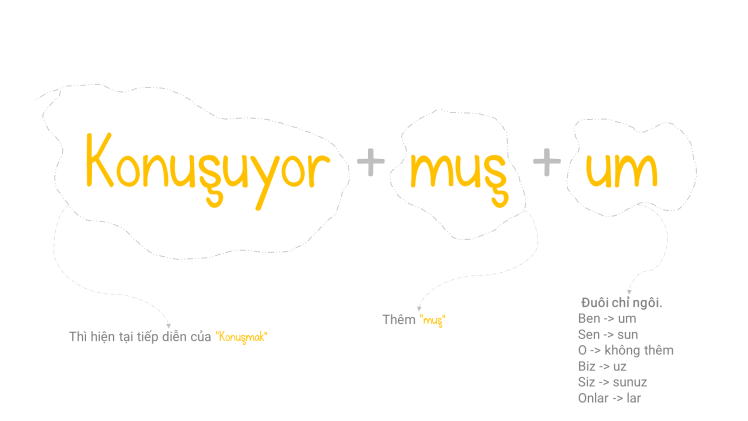 Thì hiện tại tiếp diễn của động từ + mu + y + muş + đuôi chỉ ngôi