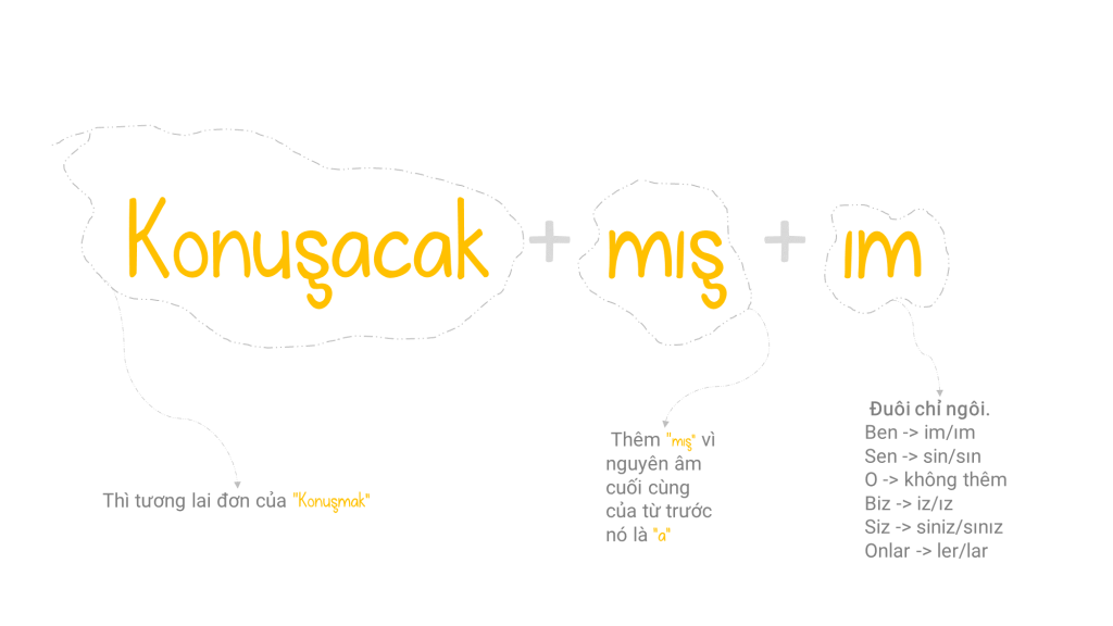 Thì tương lai đơn của động từ + mi/mı + y + miş/mış + đuôi chỉ ngôi
