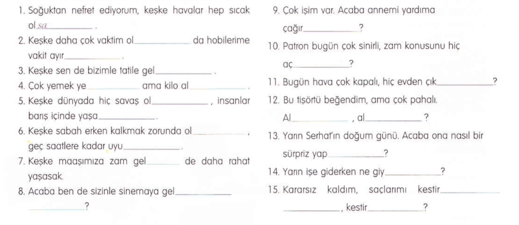 Chúng ta hoàn toàn có thể dự đoán được từ “ước” trong tiếng Thổ là gì đúng không? Đúng vậy, là “keşke”. Tuy nhiên, để nói mình “ước” một điều gì đó, chúng ta không chỉ thêm “keşke” là xong. Tiếng Thổ mà, chẳng mấy khi chỉ đơn giản thêm từ vào câu mà nó còn cần biến đổi hậu tố của động từ trong câu nữa.