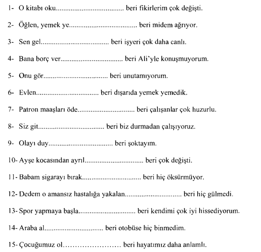 - Và từ nối, chắc chắn vẫn sẽ là -den/dan beri (kể từ khi)