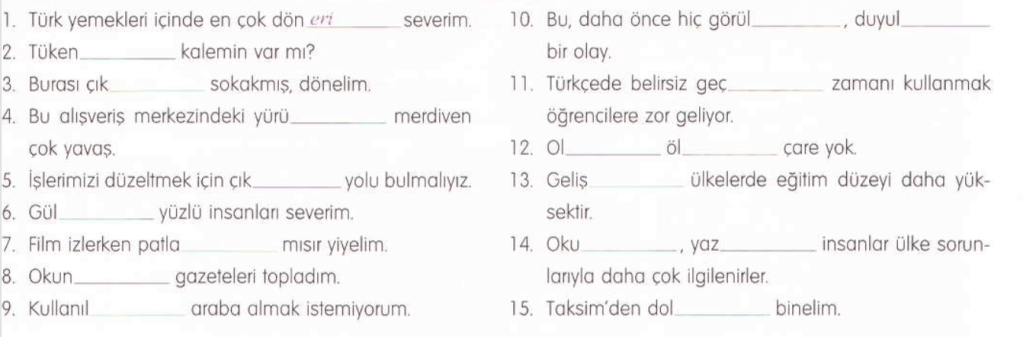 Có rất nhiều phân từ cố định trong tiếng Thổ và không có quy luật gì cả. Chúng ta buộc lòng phải học thuộc thôi.