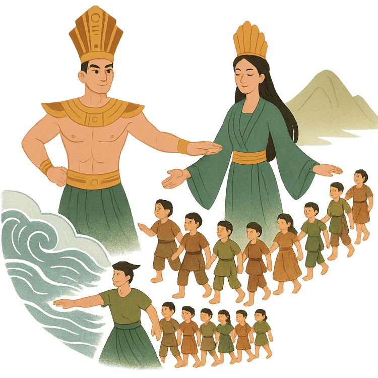 Nhưng rồng thuộc về biển, tiên quyến luyến núi cao. Khi duyên phận chia lìa, Lạc Long Quân và Âu Cơ quyết định chia đôi đàn con: 50 người theo mẹ lên rừng, mở lối cho văn hóa nông nghiệp miền núi, 50 người theo cha xuống biển, xây dựng đời sống ven sông nước. Sự phân chia này không những là câu chuyện địa lý, mà còn là dấu ấn đầu tiên của một dân tộc biết thích nghi, hòa hợp giữa núi và biển. Người con trưởng được tôn làm Hùng Vương, đặt nền móng cho nhà nước Văn Lang – nhà nước đầu tiên trong lịch sử Việt Nam, khởi nguồn cho một hành trình văn minh rực rỡ.